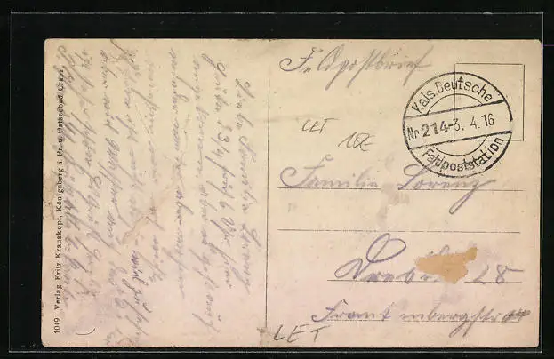 Personenbezogene Daten auf der Rückseite der Karte wurden durch blauen Textmarker unkenntlich gemacht. Die blauen Stellen sind auf die Vorderseite durchgeweicht und wirken sich negativ auf das Postkartenfoto aus