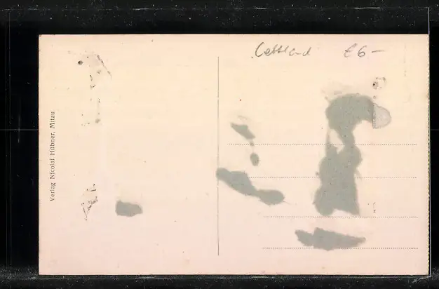 Personenbezogene Daten auf der Rückseite der Karte wurden durch blauen Textmarker unkenntlich gemacht. Die blauen Stellen sind auf die Vorderseite durchgeweicht und wirken sich negativ auf das Postkartenfoto aus