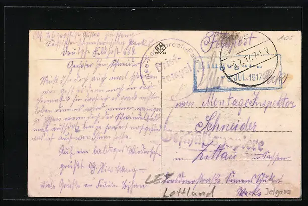 Personenbezogene Daten auf der Rückseite der Karte wurden durch blauen Textmarker unkenntlich gemacht. Die blauen Stellen sind auf die Vorderseite durchgeweicht und wirken sich negativ auf das Postkartenfoto aus