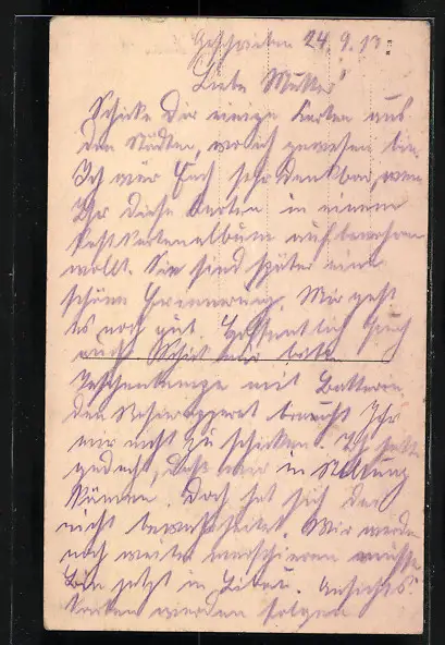 Personenbezogene Daten auf der Rückseite der Karte wurden durch blauen Textmarker unkenntlich gemacht. Die blauen Stellen sind auf die Vorderseite durchgeweicht und wirken sich negativ auf das Postkartenfoto aus