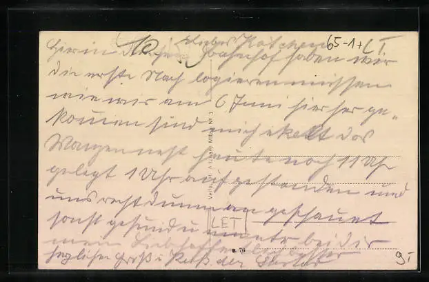 Personenbezogene Daten auf der Rückseite der Karte wurden durch blauen Textmarker unkenntlich gemacht. Die blauen Stellen sind auf die Vorderseite durchgeweicht und wirken sich negativ auf das Postkartenfoto aus