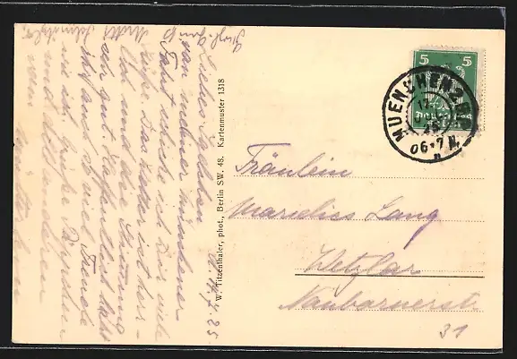 Personenbezogene Daten auf der Rückseite der Karte wurden durch blauen Textmarker unkenntlich gemacht. Die blauen Stellen sind auf die Vorderseite durchgeweicht und wirken sich negativ auf das Postkartenfoto aus
