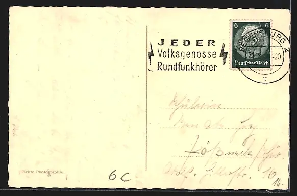 Personenbezogene Daten auf der Rückseite der Karte wurden durch blauen Textmarker unkenntlich gemacht. Die blauen Stellen sind auf die Vorderseite durchgeweicht und wirken sich negativ auf das Postkartenfoto aus