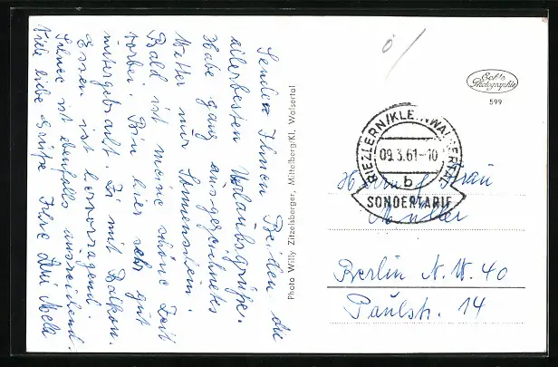 Personenbezogene Daten auf der Rückseite der Karte wurden durch blauen Textmarker unkenntlich gemacht. Die blauen Stellen sind auf die Vorderseite durchgeweicht und wirken sich negativ auf das Postkartenfoto aus