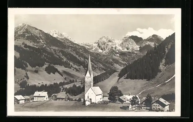 AK Mittelberg, Panorama mit Kirche und Schafalpköpf