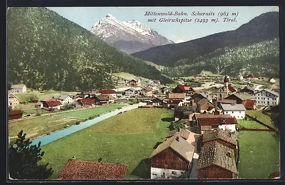 AK Mittenwald, Fernansicht mit Scharnitz und Gleirschspitze