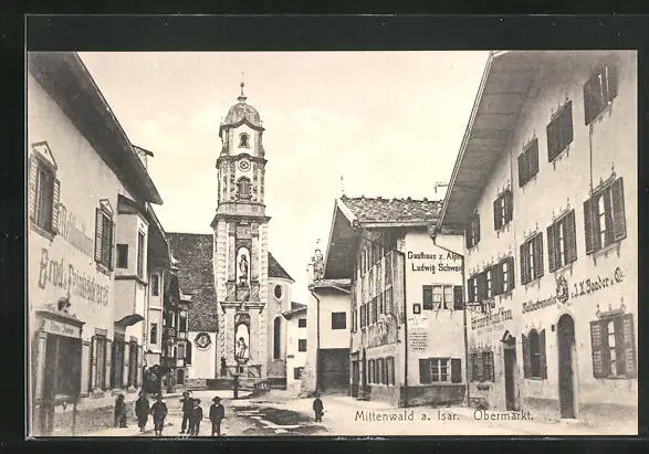 AK Mittenwald /Isar, Obermarkt mit Gasthaus z. Alpen