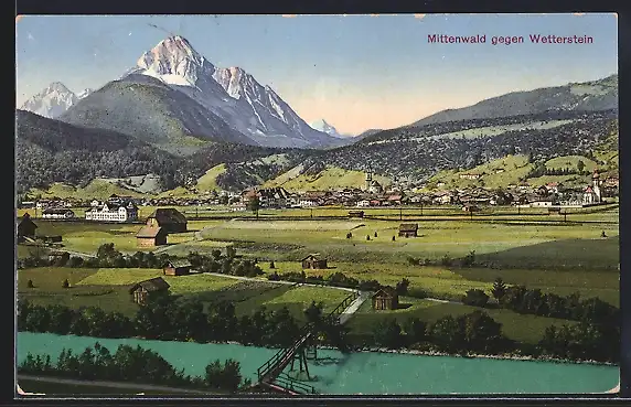 AK Mittenwald, Ortsansicht gegen Wetterstein