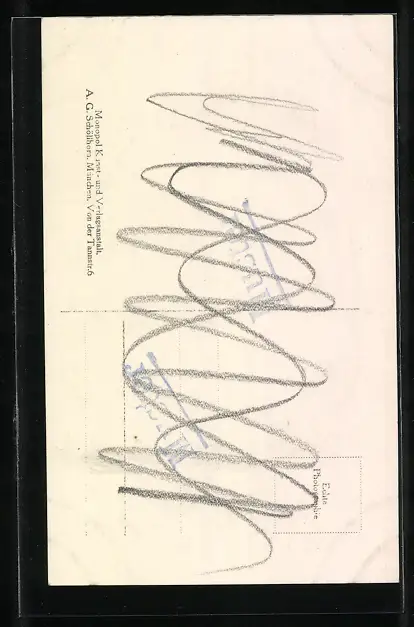 Personenbezogene Daten auf der Rückseite der Karte wurden durch blauen Textmarker unkenntlich gemacht. Die blauen Stellen sind auf die Vorderseite durchgeweicht und wirken sich negativ auf das Postkartenfoto aus