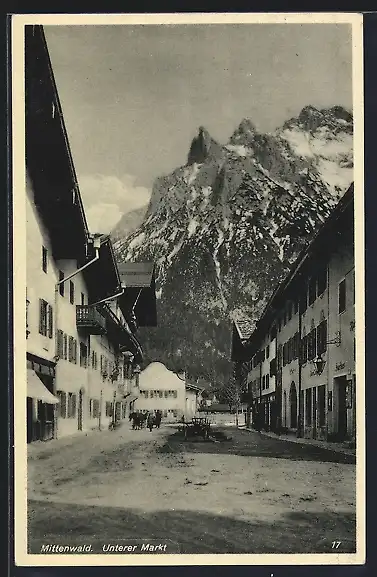 AK Mittenwald, Strasse Unterer Markt gegen das Gebirge