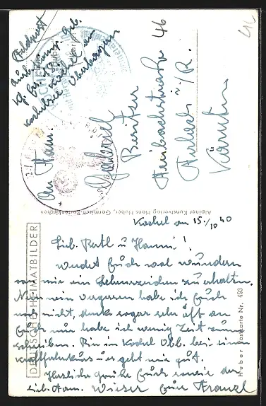 Personenbezogene Daten auf der Rückseite der Karte wurden durch blauen Textmarker unkenntlich gemacht. Die blauen Stellen sind auf die Vorderseite durchgeweicht und wirken sich negativ auf das Postkartenfoto aus