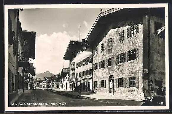 AK Mittenwald, Strassenpartie mit Neunerhaus