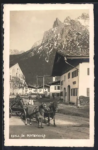 AK Mittenwald, Strassenpartie mit Ochsenwagen