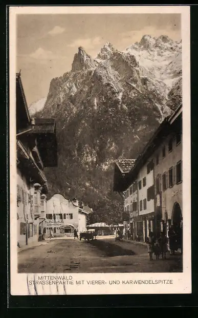 AK Mittenwald, Strassenpartie mit Vierer- und Karwendelspitze