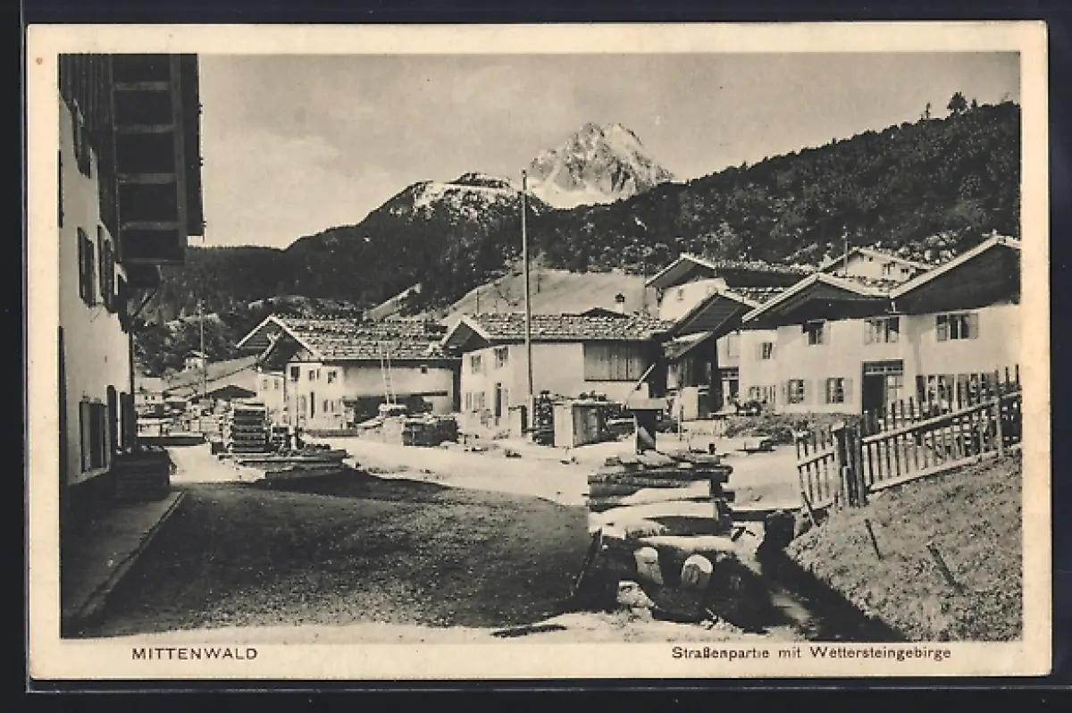 AK Mittenwald, Strassenpartie mit Wettersteingebirge
