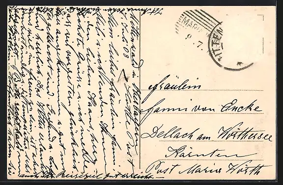 alte Ansichtskarte, gelaufen, Briefmarke entfernt, rückseitig Oberflächenschaden, guter Zustand