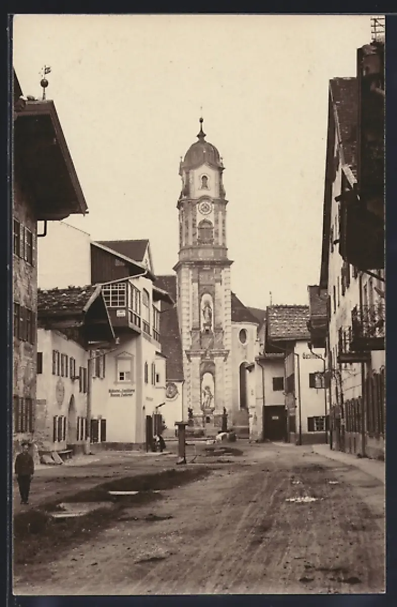 AK Mittenwald a. Isar, Strassenpartie mit Kirche