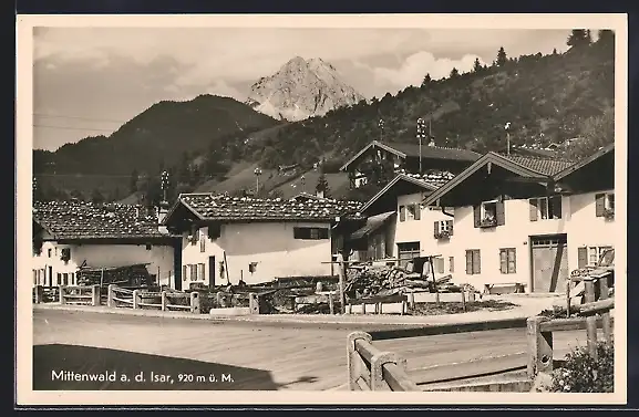 AK Mittenwald a. d. Isar, Strassenpartie mit Bergen