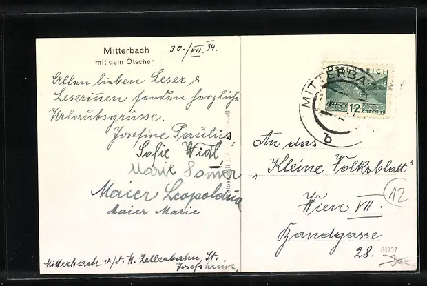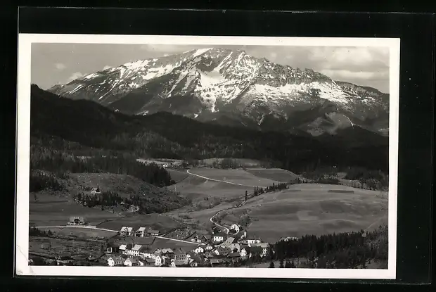 AK Mitterbach, Schneebedeckter Ötscher hinter dem Ort