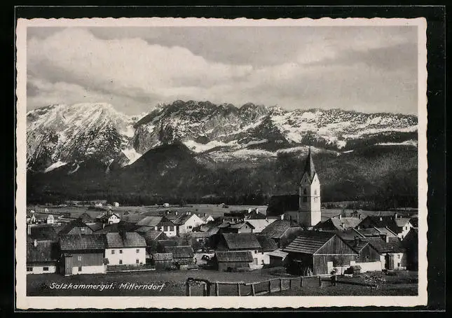 AK Mitterndorf, Ortspartie mit Kirche und den Bergen
