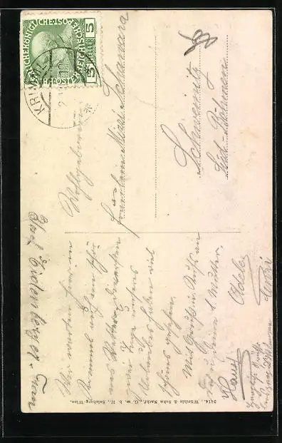 Personenbezogene Daten auf der Rückseite der Karte wurden durch blauen Textmarker unkenntlich gemacht. Die blauen Stellen sind auf die Vorderseite durchgeweicht und wirken sich negativ auf das Postkartenfoto aus
