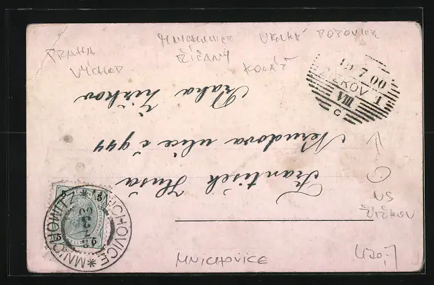 alte Ansichtskarte, gelaufen 1900, Stempelspur, Eckknicke re. oben und li. unten, guter Zustand