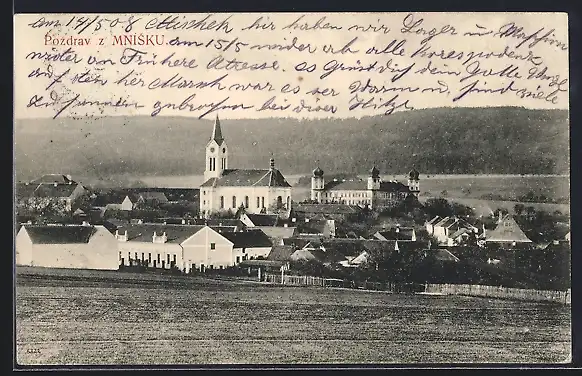 AK Mnisek, Ortstotale mit Kirche und Schloss im Hintergrund