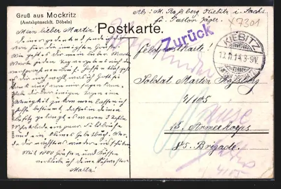 gelaufen 1914, Eckknick unten, Abriebspuren li. u. re. unten, guter Zustand