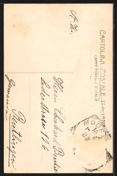 Personenbezogene Daten auf der Rückseite der Karte wurden durch blauen Textmarker unkenntlich gemacht. Die blauen Stellen sind auf die Vorderseite durchgeweicht und wirken sich negativ auf das Postkartenfoto aus