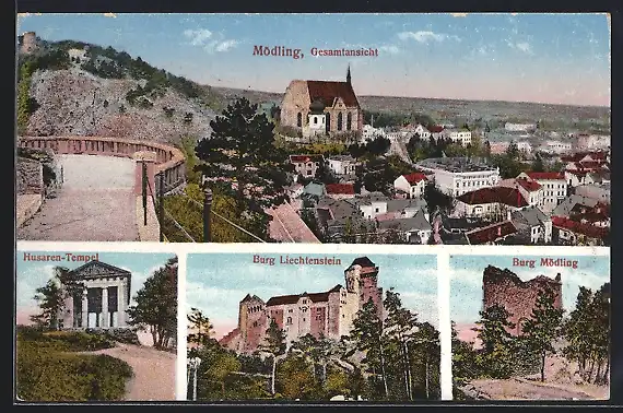 AK Mödling, Husarentempel, Burg Mödling, Schloss Liechtenstein, Gesamtansicht