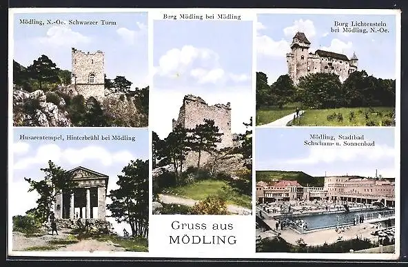 AK Mödling, Husarentempel, Stadtbad, Schwarzer Turm
