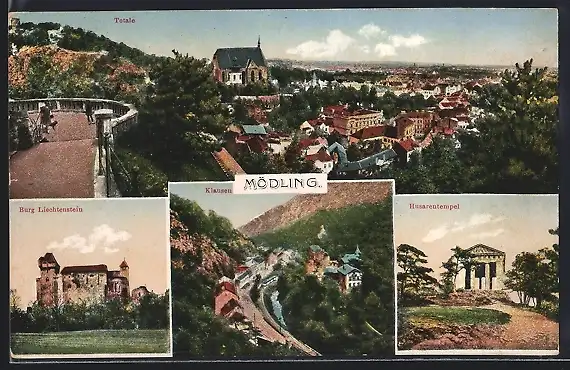 AK Mödling, Klausen, Burg Liechtenstein, Husarentempel und Totalansicht