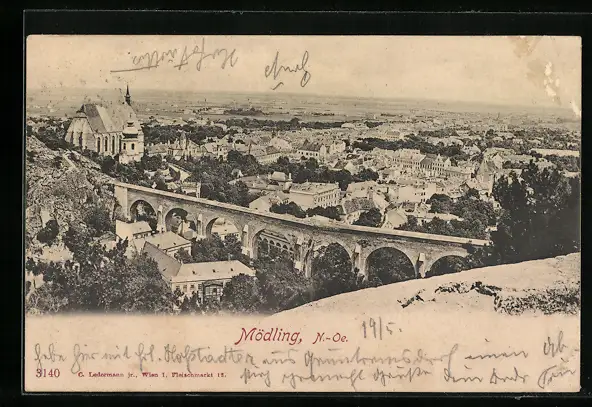 AK Mödling, Ortsansicht mit Viadukt aus der Vogelschau