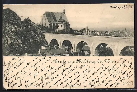 AK Mödling, Teilansicht mit Viadukt und Kirche