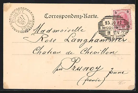 gelaufen 1897, Abriebspuren li., vorder- und rückseitig Klebe- und Papierreste, minimaler Eckschaden li. unten