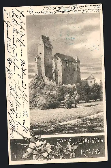 AK Mödling, Veste Lichtenstein, gerahmt von Blumen