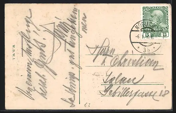 Personenbezogene Daten auf der Rückseite der Karte wurden durch blauen Textmarker unkenntlich gemacht. Die blauen Stellen sind auf die Vorderseite durchgeweicht und wirken sich negativ auf das Postkartenfoto aus