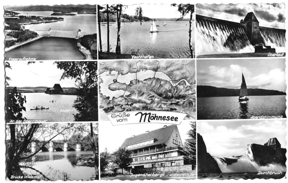 Ansichtskarte Möhnesee Grüße vom Möhnesee, neun Abb. Erhaltung I-II, Marke entfernt, Beförderungsspuren postalisch gelaufen, gestempelt: unleserlich, um 1959 Verlag: Cramers Kunstanstalt KG, Dortmund