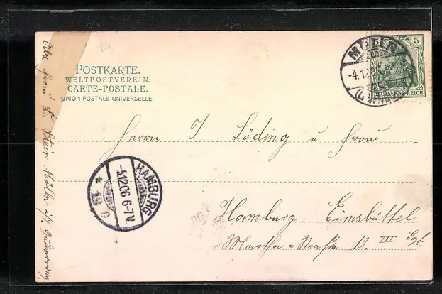 alte Ansichtskarte, gelaufen 1906, rückseitig Klebe- und Papierreste, guter Zustand