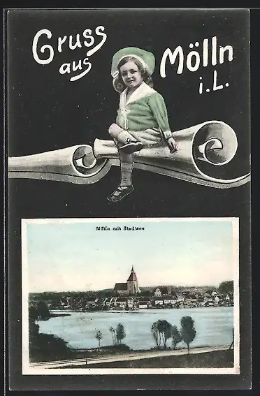 AK Mölln i. L., Ortsansicht mit Stadtsee, süsses Kind