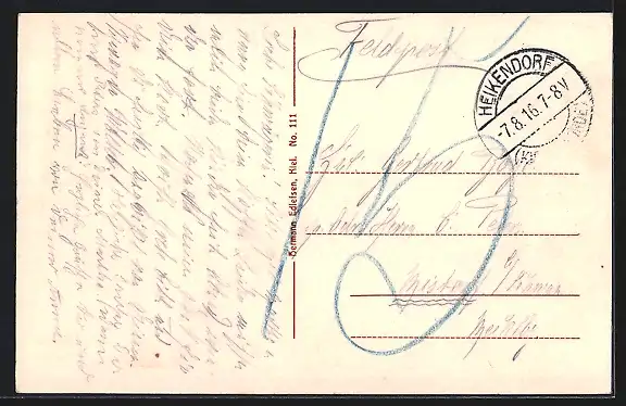 Personenbezogene Daten auf der Rückseite der Karte wurden durch blauen Textmarker unkenntlich gemacht. Die blauen Stellen sind auf die Vorderseite durchgeweicht und wirken sich negativ auf das Postkartenfoto aus