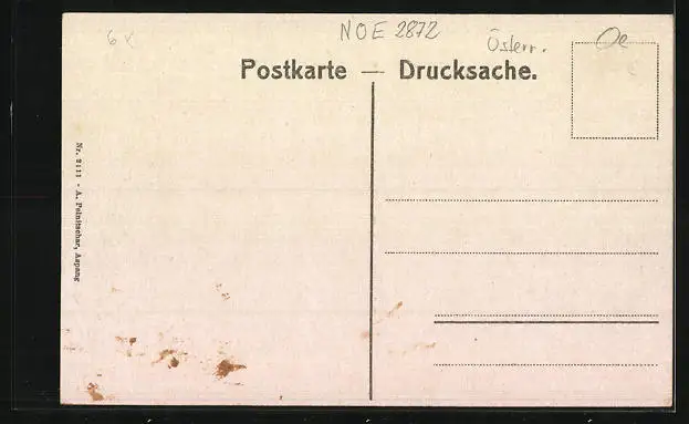 Personenbezogene Daten auf der Rückseite der Karte wurden durch blauen Textmarker unkenntlich gemacht. Die blauen Stellen sind auf die Vorderseite durchgeweicht und wirken sich negativ auf das Postkartenfoto aus