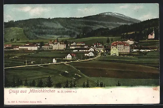 AK Mönichkirchen, Ortspanorama mit Landstrasse aus der Vogelschau