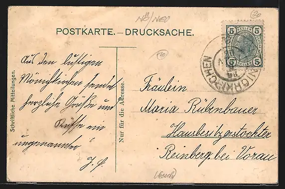 Personenbezogene Daten auf der Rückseite der Karte wurden durch blauen Textmarker unkenntlich gemacht. Die blauen Stellen sind auf die Vorderseite durchgeweicht und wirken sich negativ auf das Postkartenfoto aus
