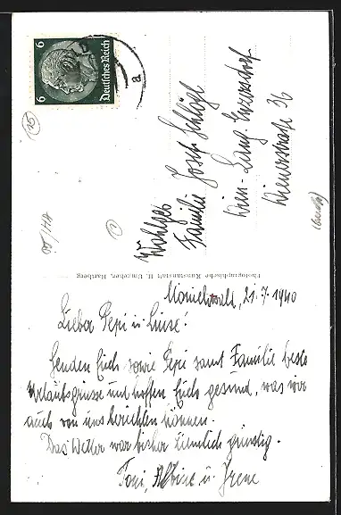 Personenbezogene Daten auf der Rückseite der Karte wurden durch blauen Textmarker unkenntlich gemacht. Die blauen Stellen sind auf die Vorderseite durchgeweicht und wirken sich negativ auf das Postkartenfoto aus