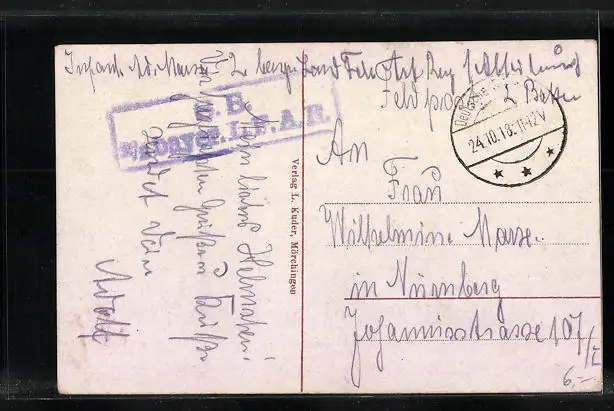 Personenbezogene Daten auf der Rückseite der Karte wurden durch blauen Textmarker unkenntlich gemacht. Die blauen Stellen sind auf die Vorderseite durchgeweicht und wirken sich negativ auf das Postkartenfoto aus