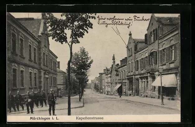 AK Mörchingen i. L, Kapellenstrasse mit Soldaten
