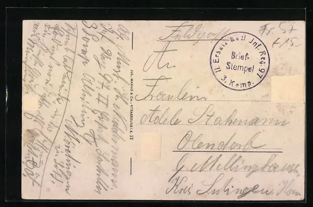Personenbezogene Daten auf der Rückseite der Karte wurden durch blauen Textmarker unkenntlich gemacht. Die blauen Stellen sind auf die Vorderseite durchgeweicht und wirken sich negativ auf das Postkartenfoto aus