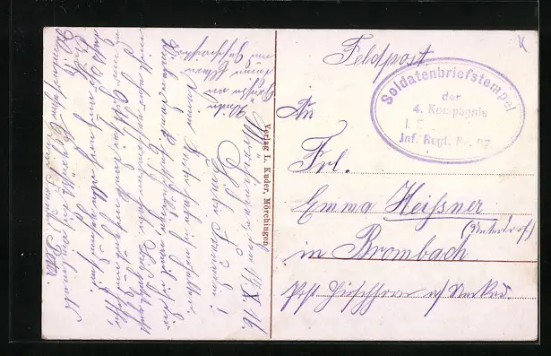 Personenbezogene Daten auf der Rückseite der Karte wurden durch blauen Textmarker unkenntlich gemacht. Die blauen Stellen sind auf die Vorderseite durchgeweicht und wirken sich negativ auf das Postkartenfoto aus