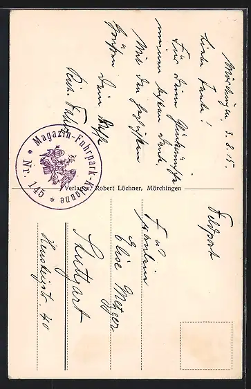 Personenbezogene Daten auf der Rückseite der Karte wurden durch blauen Textmarker unkenntlich gemacht. Die blauen Stellen sind auf die Vorderseite durchgeweicht und wirken sich negativ auf das Postkartenfoto aus